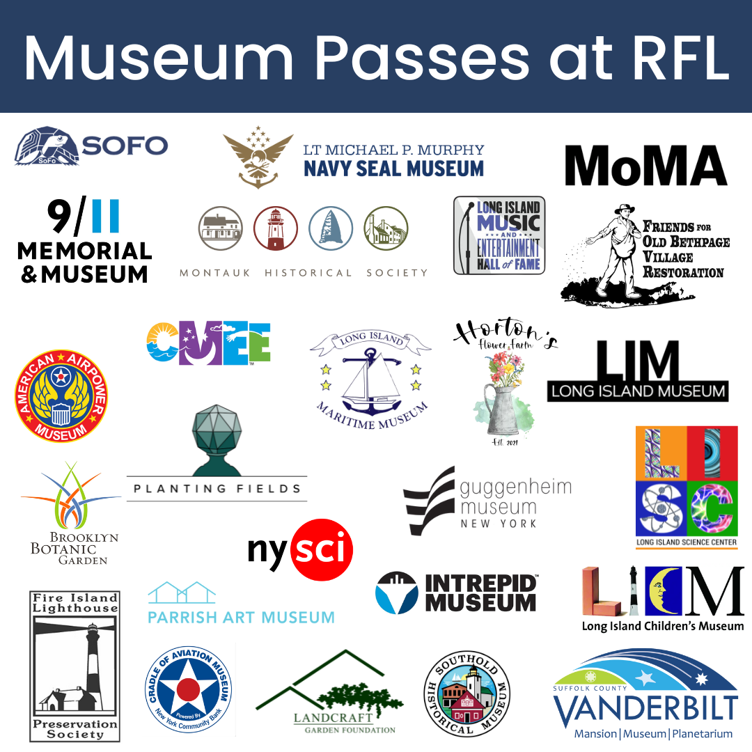 Riverhead Free Library is pleased to offer a variety of museum passes and discounted tickets for checkout or purchase to RFL cardholders. These passes will allow RFL cardholders, 18 years and older to gain free entrance for a predetermined number of guests that will vary at each museum. Accounts must be in good standing to borrow passes and guests must abide by the conditions determined at each museum location.