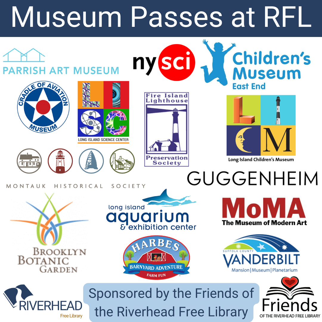 Riverhead Free Library is pleased to offer a variety of museum passes and discounted tickets for checkout or purchase to RFL cardholders. These passes will allow RFL cardholders, 18 years and older to gain free entrance for a predetermined number of guests that will vary at each museum. Accounts must be in good standing to borrow passes and guests must abide by the conditions determined at each museum location.